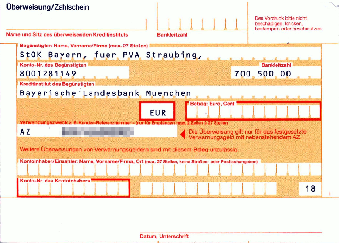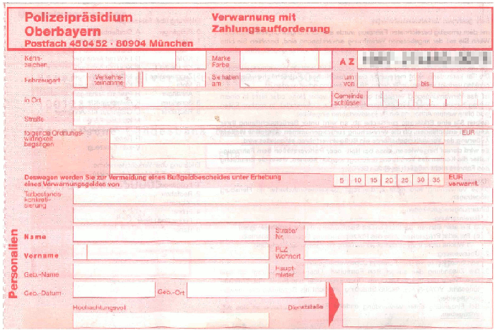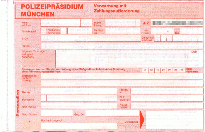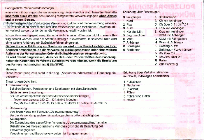 Eine Ahndung auch von geringfügigen Ordnungswidrigkeiten nach § 56 ff des deutschen Ordnungswidrigkeitengesetzes (OWiG) wird Verwarnung genannt. Sie kann schriftlich oder mündlich erfolgen und kann mit oder ohne Erhebung eines Verwarngeldes verbunden sein.Polizeipräsidium München | Rückseite der Verwarnung | Überweisung/Zahlschein |